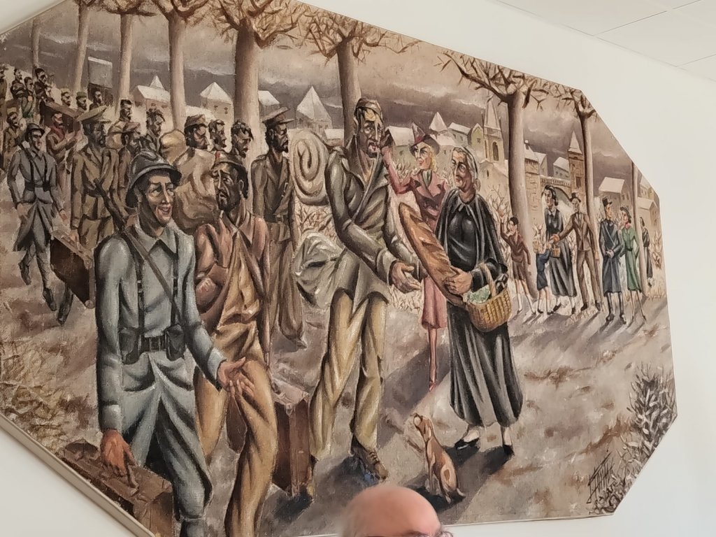La peinture présentée, peinte par Conti, idéalise et illustre l'arrivée au camp des hommes. On voit des soldats riants, des Espagnols de toutes conditions, une grand-mère nourricière, une femme exultante, une famille spectatrice et une femme se cachant derrière un arbre, a-t-elle peur ou honte ? Cette toile est le reflet de l’expérience vécue : chaque habitant avait désormais à cohabiter avec ce camp et partager cet espace, quelles que soient ses idées, sa classe sociale ou ses convictions politiques.