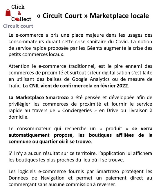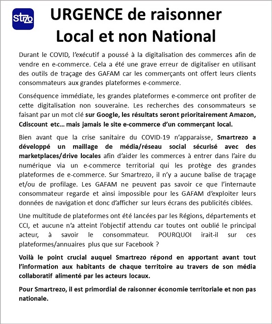 Un Numérique Souverain Français OUI mais pas seulement, car le numérique qui est incontournable doit impérativement être adapté à chaque territoire afin d'en protéger son économie circulaire. Vouloir contrer les plateformes e-commerce des GAFAM et BATX n'est pas suffisant, car les grandes plateformes françaises font autant de mal aux petits commerces de proximité. Voilà pourquoi l'architecture de la plateforme Smartrezo commence au niveau des communes et remonte jusqu'au niveau international. La Souveraineté ne doit pas se cantonner à la protection des données mais bien à la protection de l'économie des territoires.